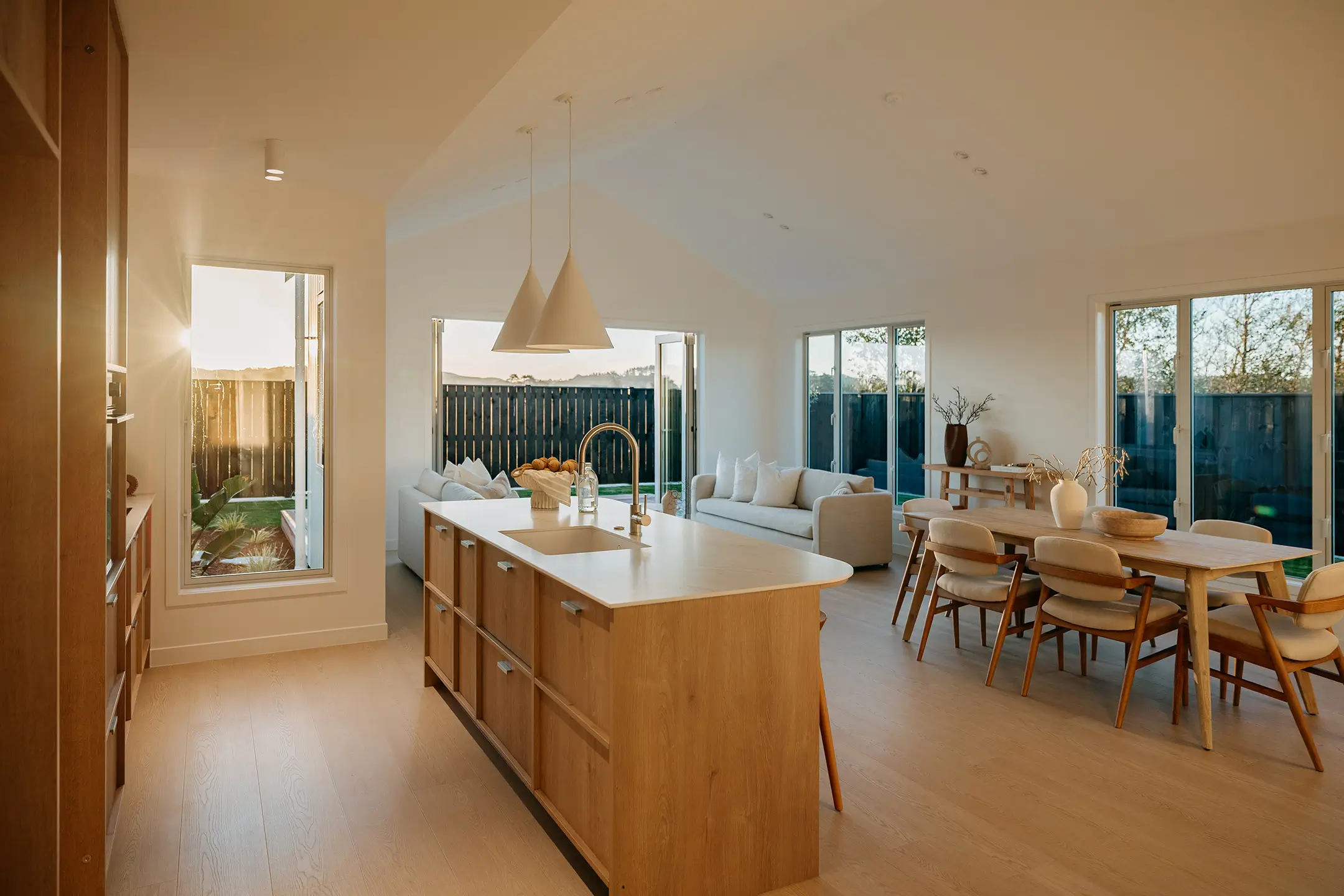 Beautiful natural materials, like the oak timber flooring, warm lighting and functional layout bring the Nordic design influence of this home to life.