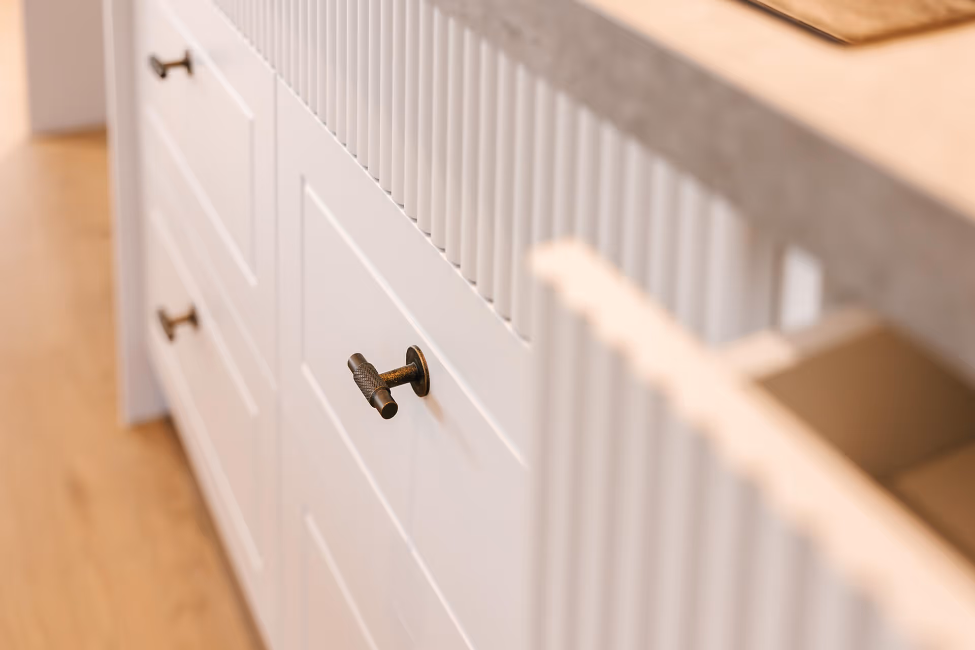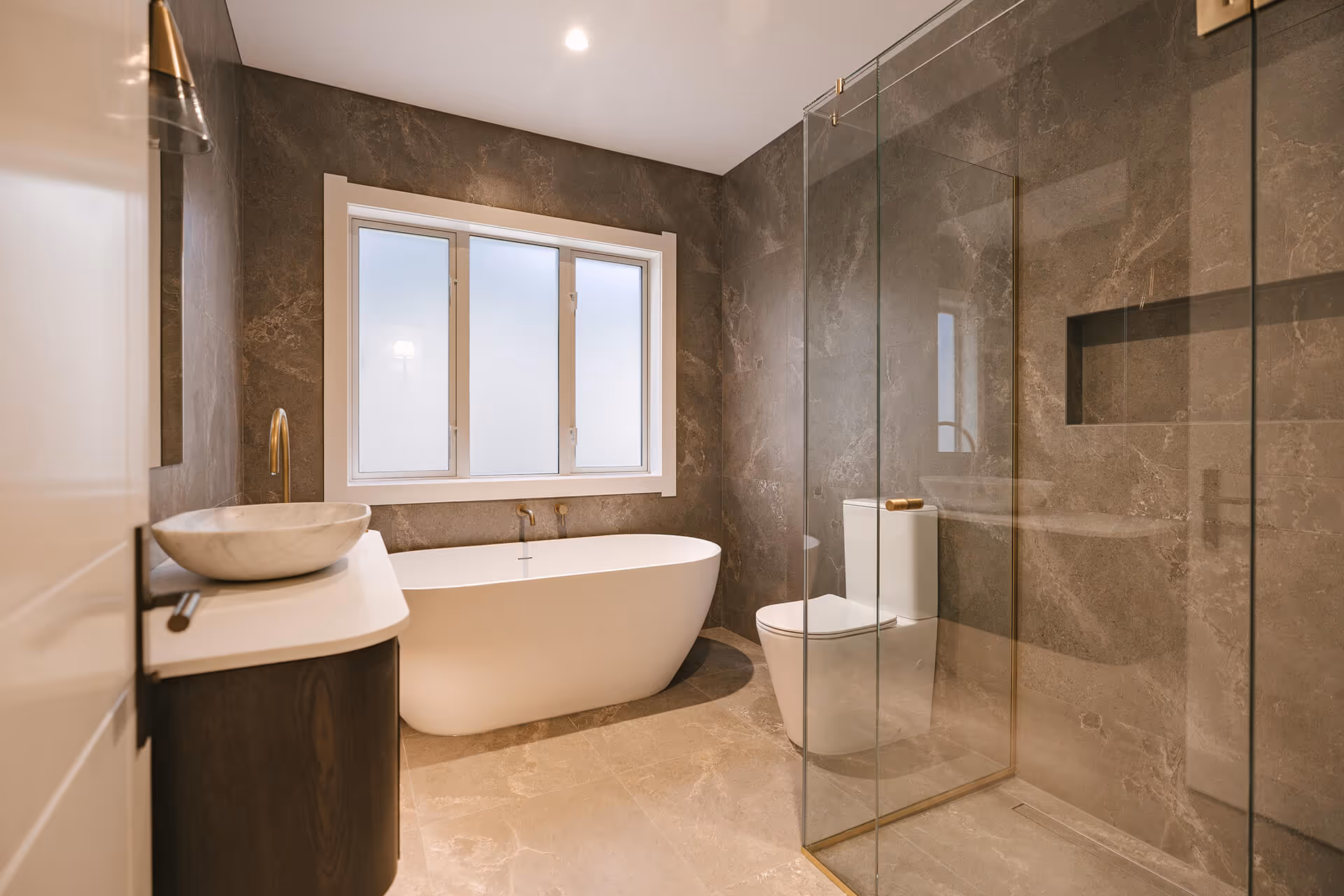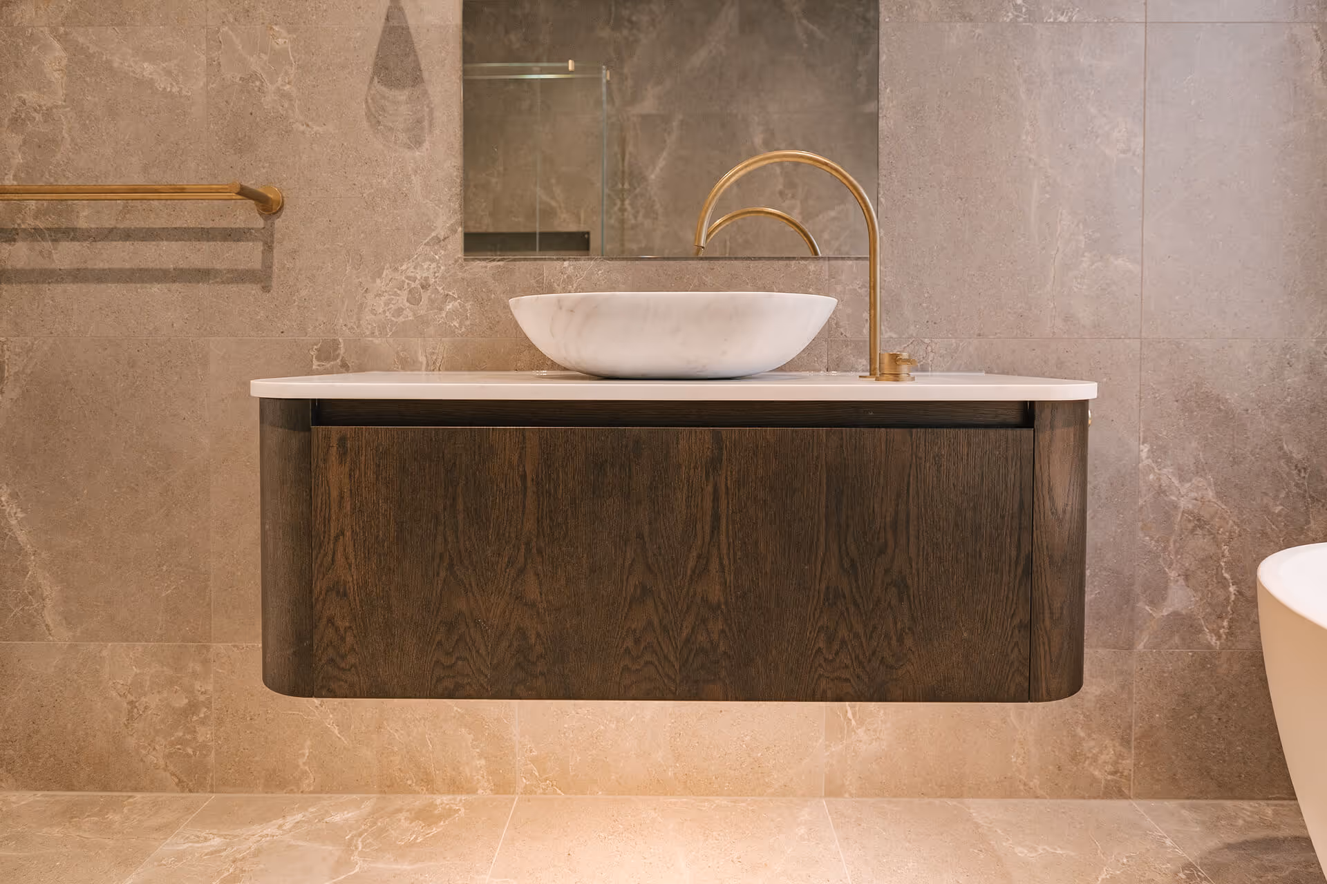 Brass, wood and wool. These timeless products have authentic texture, smell, and intrinsic value. We carefully selected unique brass detailing throughout this home, including the door hardware, the handrails, the tap ware and even the transition bars. Our personal favourite features also include the dark oak vanities, hidden powerpoints, and the master suite architrave detailing.