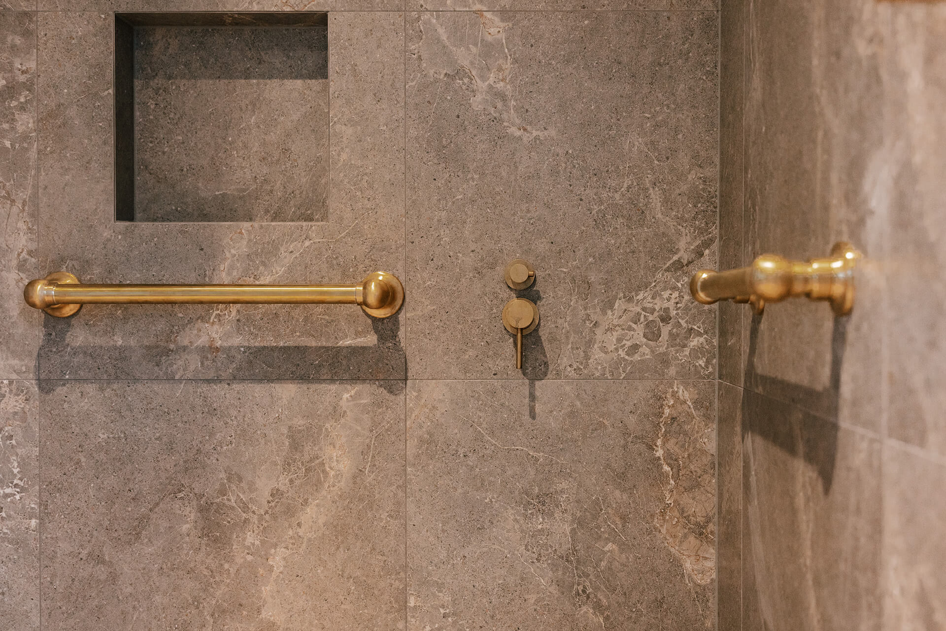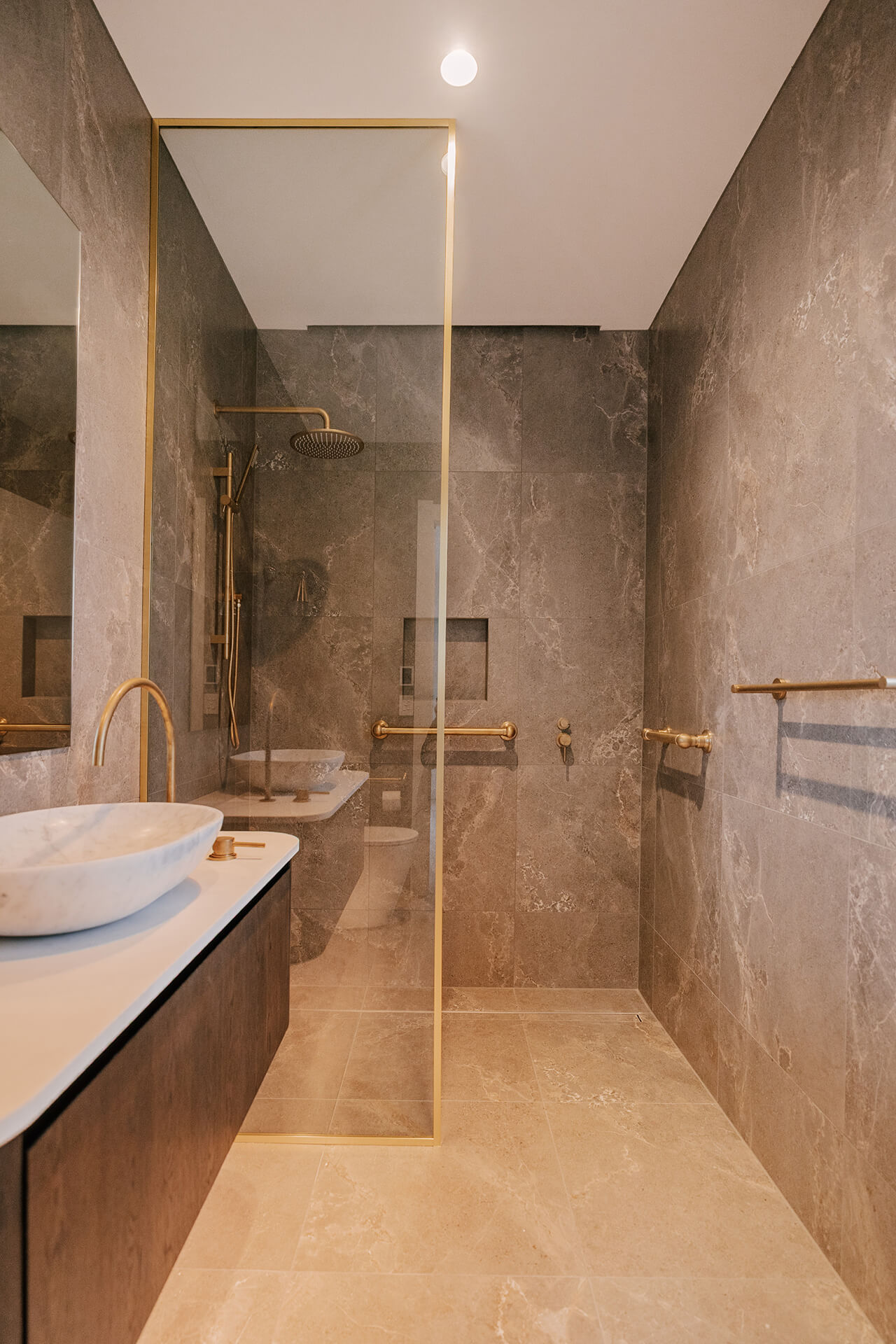 Designed with elderly parents in mind and eventually as a retirement property, every detail in this home is intentionally beautiful and forward thinking. The master suite is an excellent example. Designed for aged care, we have the beautiful Perrin and Rowe Grabrails without compromising on aesthetic.